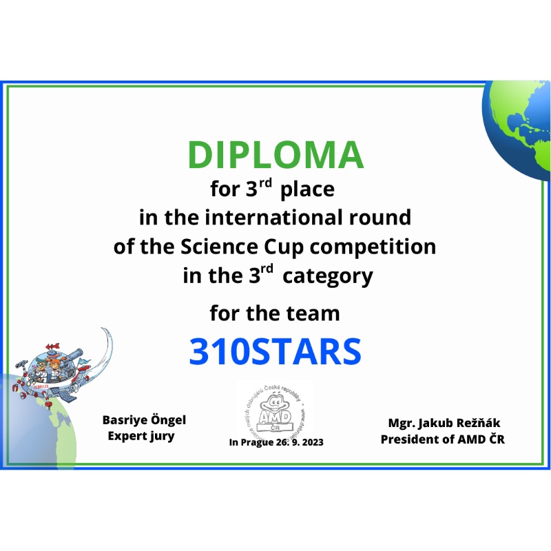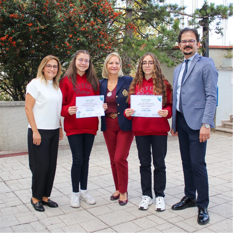 8. sınıf öğrencilerimizden Zeynep Artan ve Elif Gündüz'den oluşan 310STARS takımımız, fen bilimleri öğretmenleri Özge Senger rehberliğinde "Science Cup Pohar Vedy-Around The World" bilim yarışmasının uluslararası finalinde dünya 3.sü oldular.